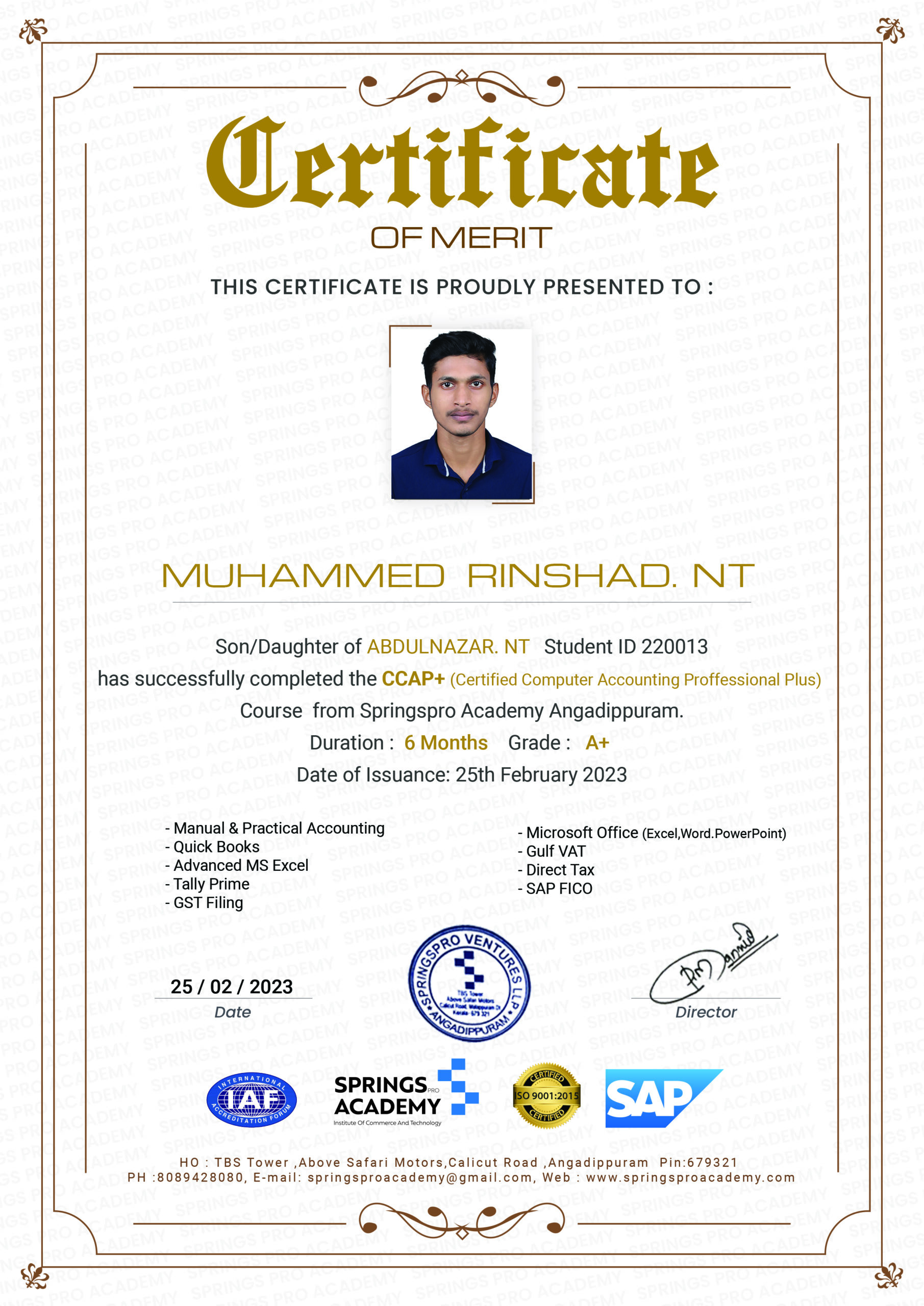220013Student Name: MUHAMMED RINSHAD.NTCourse Name: CCAP+Date of Passing: 25/02/2023 VIEW CERTIFICATE